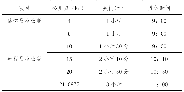 2、赛事各项目公里点关门时间(以发令枪声时间为准):
