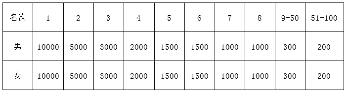 1、男、女半程马拉松赛1-3名按枪声成绩排名,其他名次按净计时排名,并分别获得现金奖励见下表。若枪声成绩相同,则按净计时成绩录取(单位:人民币/元)。