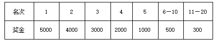 1.名次奖:男、女半程马拉松均录取前50名运动员,分别获得奖金(见下表,单位:人民币元),男、女前三名运动员各颁发领奖服一套;